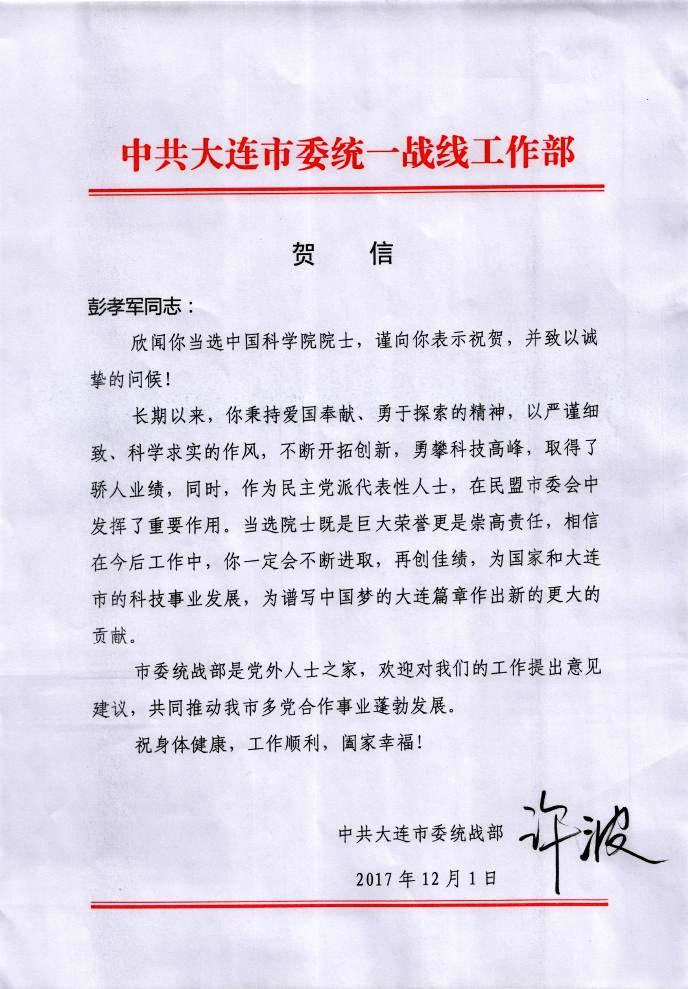 市委常委、统战部部长许波发贺信祝贺彭孝军老师当选院士